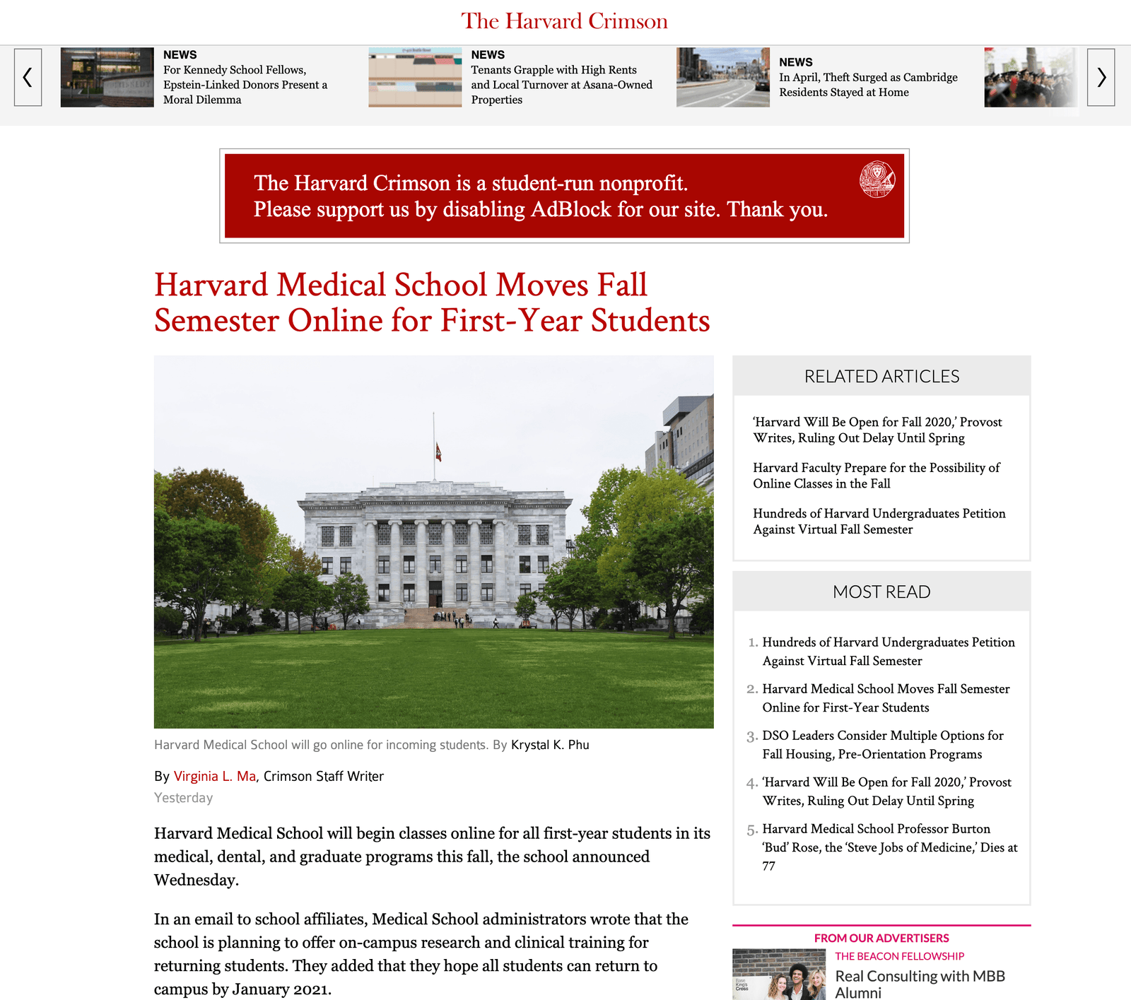 참고로, 미국 하버드 의과대학은 5.14 공식 학보인 the Harvard Crimson 을 통해 “1학년 신입생은 내년 1월까지 가을학기의 모든 강좌를 온라인으로 진행할 것”임을 확정했으며, 해당 시점의 코로나19 관련 상황이 명확하게 개선되지 않을 경우에는 봄 학기에도 “온라인 강좌”를 지속할 수 밖에 없음을 보도했다. 물론, 유럽의 의과대학 상황이 미국에 비해 더 나쁘거나 혹은 더 나은 상황이라 하더라도, 이와 같은 “의과대학 온라인 강좌”의 현실은 이미 절대 다수의 유럽 의과대학들이 현재 봄 학기 100%를 온라인으로 진행하고 있다는 점에 비추어 “가을 학기”에 관한 대비책이나 “신입생 모집”을 포함한 전체적인 “학사 운영 방침”에 있어서 대대적인 “변경 (또는 취소)”를 단정할 이유가 없음을 나타낸다고 볼 수 있다.