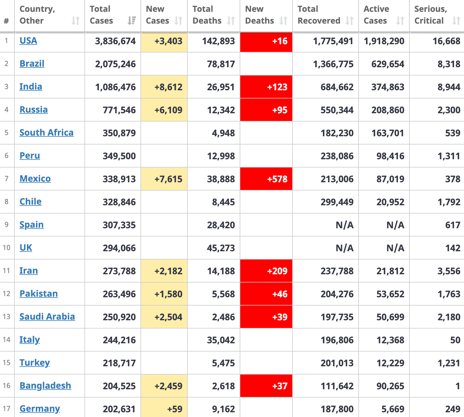 [©Worldometers.info] 세계 코로나19 감염자 순위 (7.19 기준)