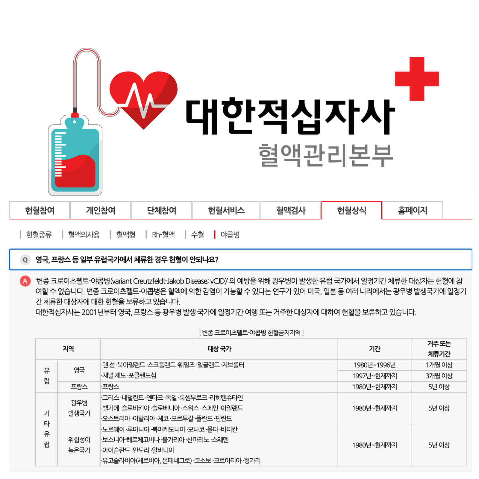 대한적십자사는 이탈리아, 헝가리, 독일을 포함한 다수의 유럽 국가에서 5년 이상 체류・거주한 사람의 국내 헌혈을 금지하고 있다 (*영국은 1-3개월 이상 체류 시 금지 적용). 이는 “변종 크로이츠펠트-야콥병(vJCD)” 예방을 위한 조치로, 지난 2001년 이후 “광우병 발생국 또는 위험성이 높은 국가”를 기준으로 이러한 “헌혈 금지” 조항을 적용하고 있다. 때문에, 기본적으로 “건강한 성인”이라는 전제에 따라 국내에서 긴급 상황에 “헌혈”할 경우, 자칫 혈액관리본부의 이러한 지침을 위반하여 큰 혼란을 야기하게 될 가능성이 있으므로, 이탈리아 유학을 시작한 경우에는 아예 “한국에서 헌혈이 불가능할 수도 있다”는 생각을 갖고있는 편이 안전하다.