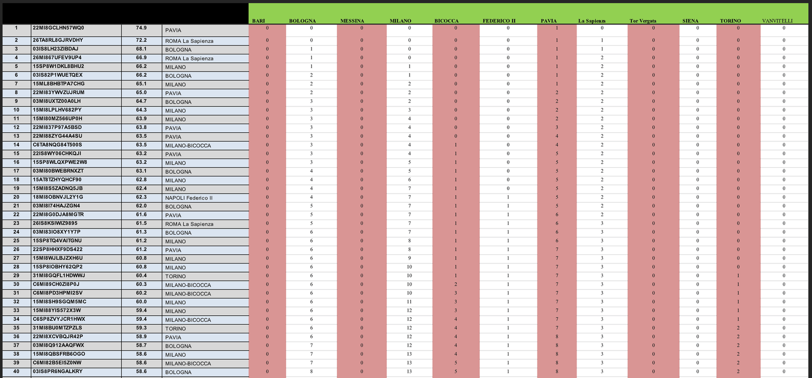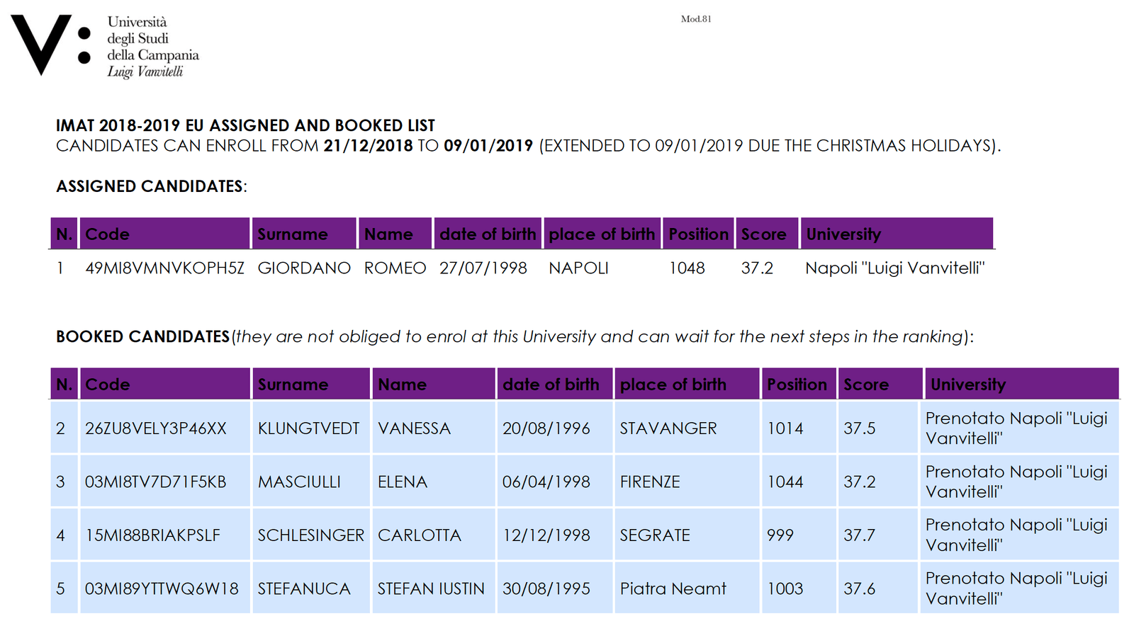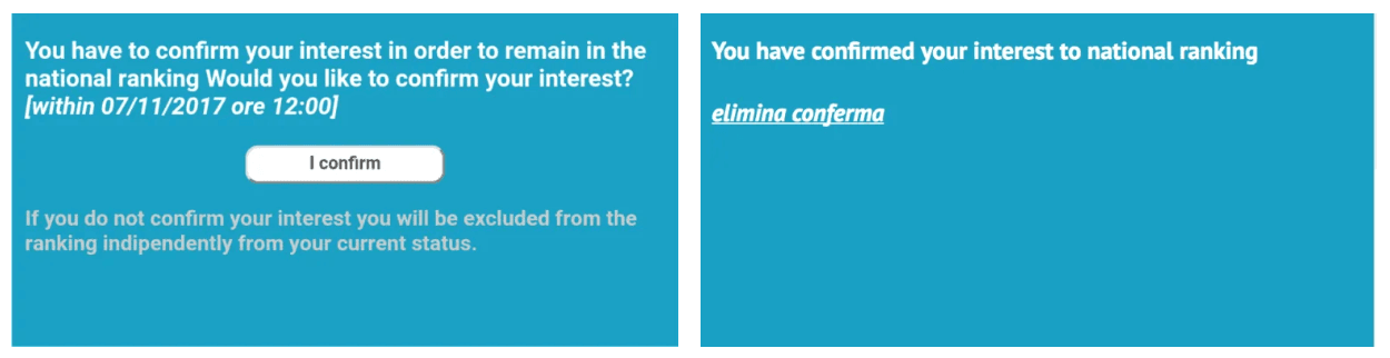 이는 단순히 1-2명의 미등록/결원이 아니기 때문에, 최고 인기 대학이라 불리는 Milan La Statale, Pavia, Rome La Sapienza, Rome Tor Vergata, Bologna 의 경우, 전체 랭킹에서 400위권 이후의 EU 지원자가 등록하는 경우도 종종 있다. 특히, 매주 1등부터 순서대로 입학 권유가 이루어지기 때문에, 이러한 경우 12월 이후에 400위권에 해당하는 학생에게 Assigned 가 주어지기도 하는 것이다.