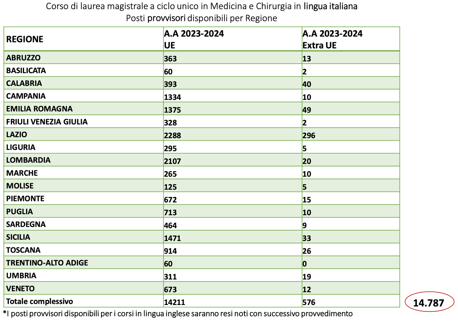 지난 해 대비, 약 600명 가량을 추가로 선발하는 2023-2024학년도 이탈리아 의과대학 신입학 정원은 총 1만4천787명으로, 이 가운데 대한민국과 미국, 캐나다 등에서 고교 과정을 이수한 non-EU 지원자는 총 576명을 선발할 계획이다. 각 지역별 non-EU 지원자의 선발 규모를 살펴보면, 로마 사피엔자 의과대학과 로마 토르 베르가타(TV) 의과대학 등이 소재한 Lazio (라치오) 주에서 전체의 절반에 가까운 296명을 선발하며, 볼로냐와 파르마 의과대학 등이 소재한 Emilia Romagna (에밀리아 로마냐) 주에서 49명과 메씨나 의과대학이 속한 Sicilia (시칠리아) 주가 33명을 선발하는 것으로 나타났다.