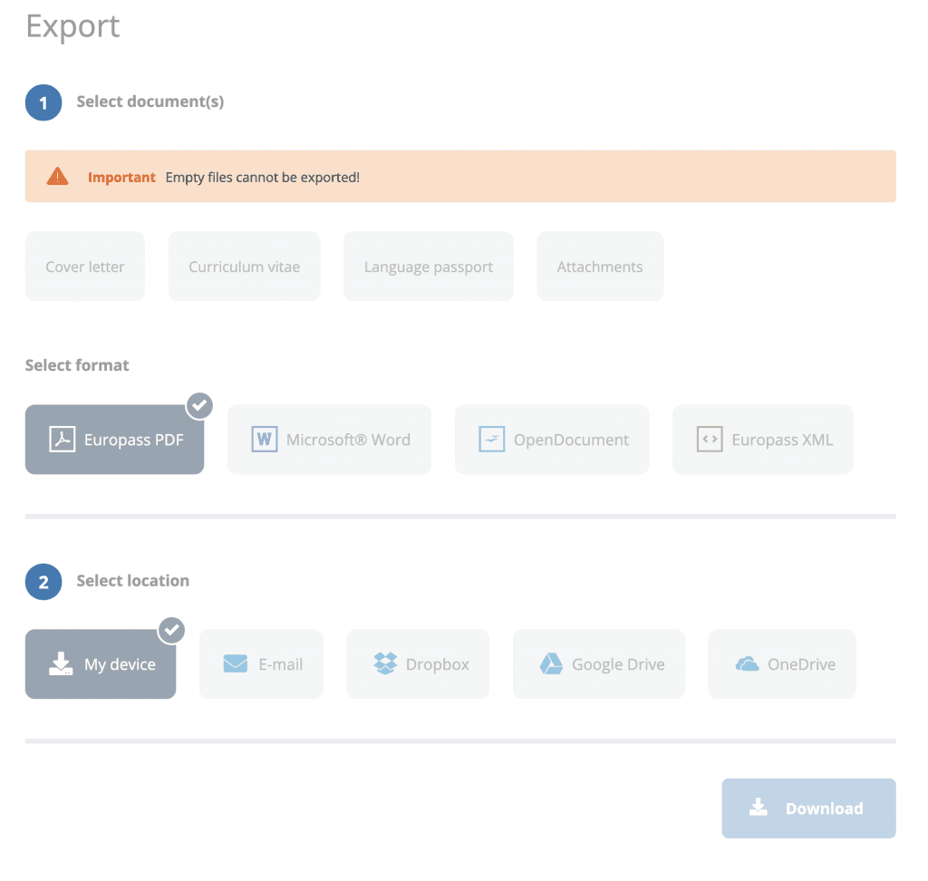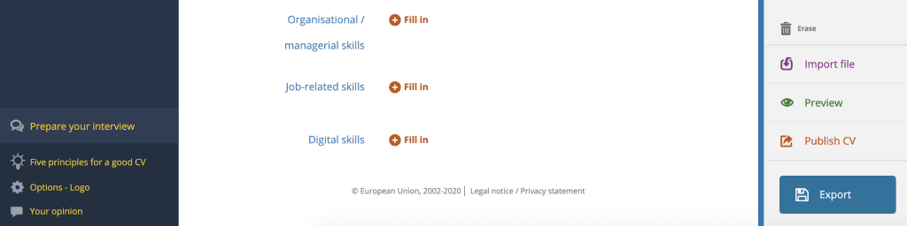 - 작성 완료 후, 화면 맨 아래 오른편의 “export” 기능을 통해 europass PDF 형식으로 다운로드합니다