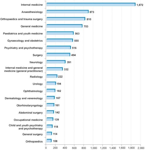 먼저 하단 그래픽을 통해 확인이 가능한대로, 독일의 “외국인 의사” 채용 현황은 해마다 증가하고 있으며, 이는 지방 소도시 등의 전반적인 “구인난”에 기인할 뿐만 아니라, 대도시의 경우에도 외국인 이민자가 증가하는 등의 사유로 꾸준히 일반의와 전문의 수요가 함께 증가하고 있다. 이는 독일 전문의들이 스웨덴, 노르웨이, 벨기에, 네덜란드, 영국 등과 같은 “더 높은 연봉”을 찾아 떠나는 현상과 더불어, 의대 입학 정원은 약 40년 전과 유사한 수준에 동결한데 비해 “주당 근무시간의 축소”와 “GP 1인당 할당 환자의 축소,” 그리고 “이민자 유입 등으로 인한 독일내 인구 증가” 등이 주된 요인으로 손꼽히고 있다.
