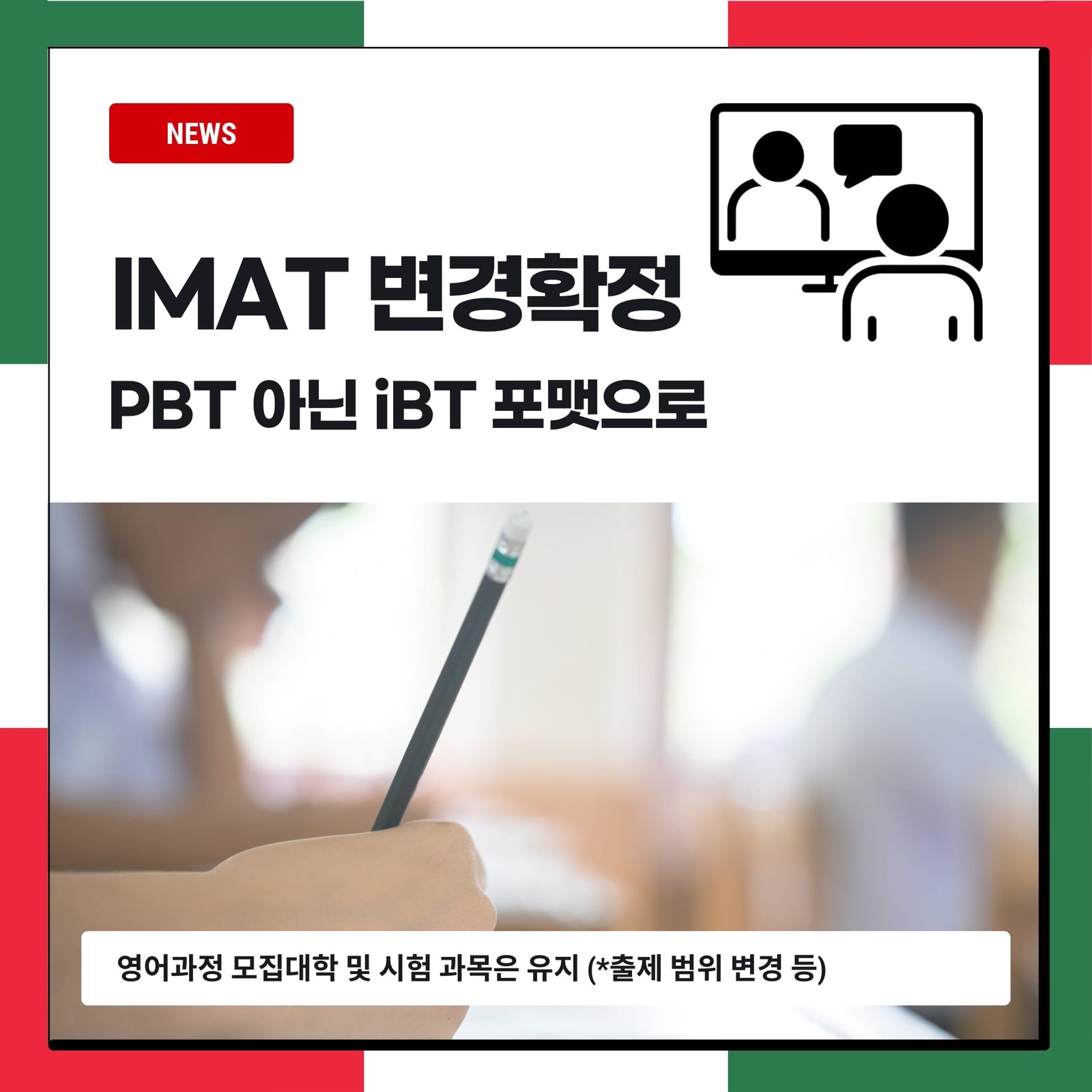 올해의 IMAT 요강에 따르면, 기본적인 시험 과목과 채점 방식 등, 큰 틀에 있어서의 추가적인 변화는 없을 것으로 나타났다. 그러나, 이탈리아어 입시의 경우에는 세부 과목별 “출제 범위”에 약간의 변화가 추가될 것으로 이탈리아 현지 입시기관들이 전망하는 가운데, IMAT 출제가 완료되기 전까지는 IMAT 과목별 출제 범위에 있어서도 추가적인 변화가 적용될 가능성을 배제할 수 없는 상황이다. 특히, 최근 3년동안 General Knowledge 의 배점이 큰 폭으로 상승한 가운데, 해당 영역을 아예 풀지 않고 biology & chemistry 등 일부 과목에만 집중하여 제한 시간을 오히려 적극 활용하는 수험생의 비중이 지속적으로 늘어왔다. 때문에, 당초 “상식 영역의 비중을 높임으로써, 유럽과 이탈리아에 대한 기본적인 지식과 적응 가능성을 평가한다”는 이탈리아 교육 당국의 목적과는 정반대로 “이탈리아와 유럽을 거의 알지 못하는” 수험생이 운 좋게 합격하는 결과로 이어진다는 각 대학과 교육 전문가들의 비판이 거세진 형국이다.